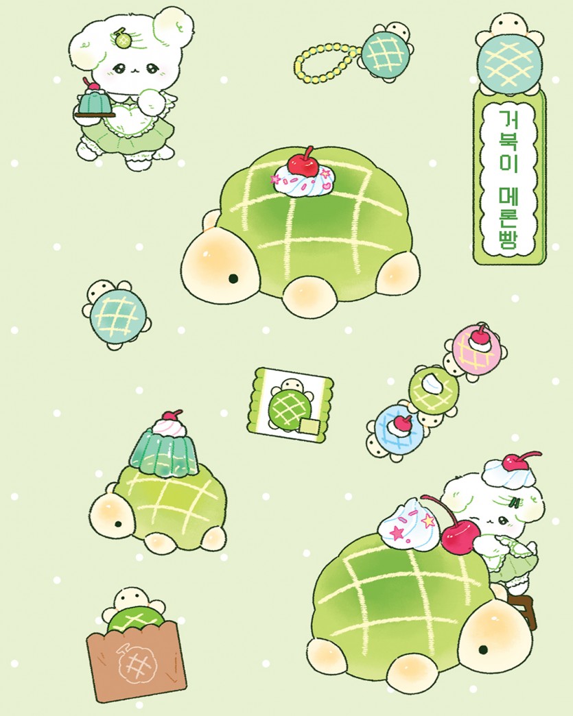 달콤한 거북이 메론빵을 만드는 몽몽이를 표현했습니다. 사랑스러운 그린으로 채색했습니다.