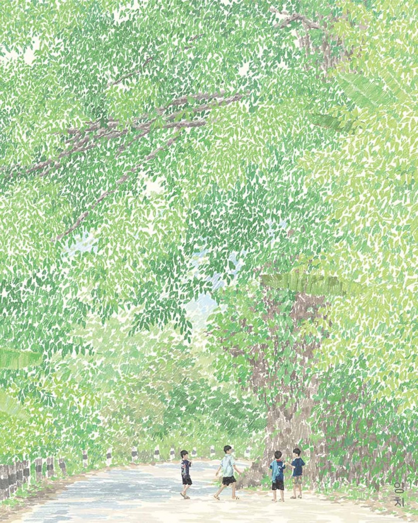 아이들이 자연 속에서 자유롭게 어우러져 노는 모습을 담아, 어린 시절의 순수한 기억과 감정을 떠오르게 하는 따뜻한 풍경입니다.