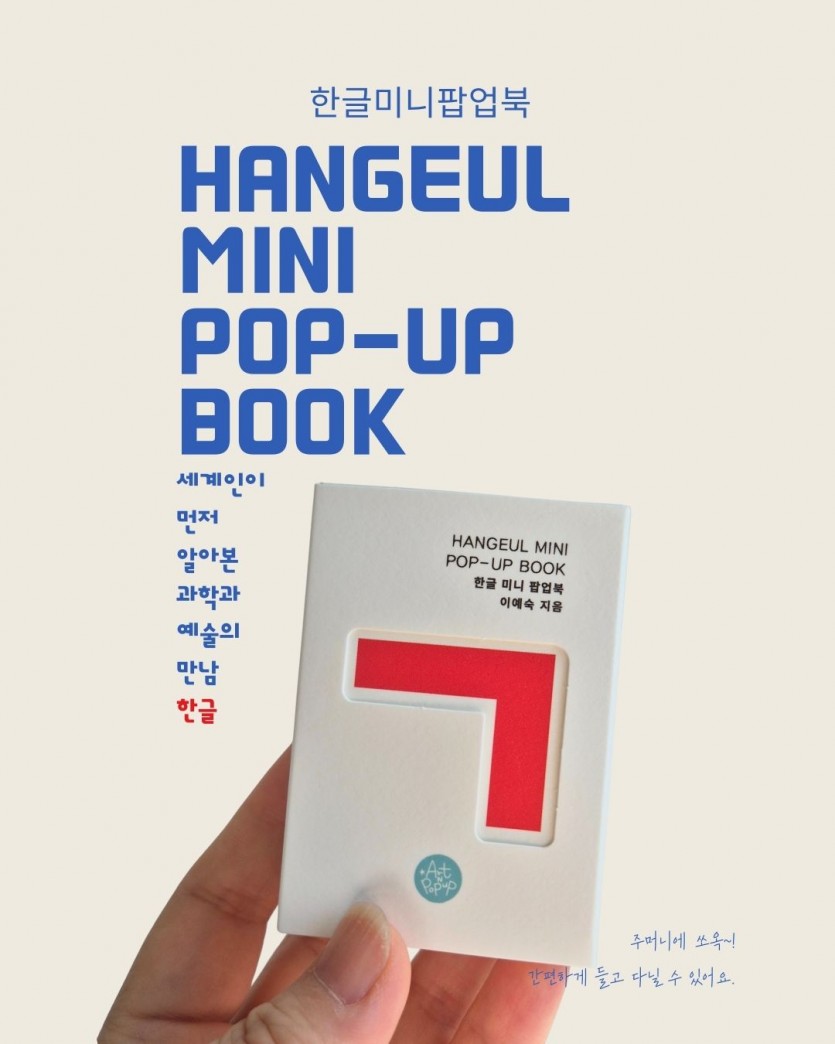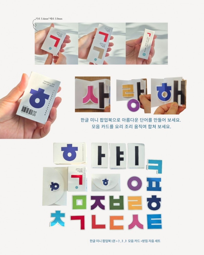<한글 미니 팝업북>은 한국 고유의 문자 ‘한글’을 한 손에 들어오는 작은 책 안에 입체적으로 구현한 작품으로, 한글의 구조적 아름다움과 조형적 가능성을 새롭게 보여주는 팝업북입니다. 이예숙 작가는 한글이 가진 조형적인 아름다움에 주목하고, 자음과 모음을 단순한 글자가 아닌 움직임과 공간을 가진 입체 구조물로 재해석하였습니다. 이 작품은 한글의 창제 원리를 시각적으로 이해하고, 글자가 어떻게 만들어지고 확장되는지를 직접 경험하도록 설계된 독창적인 아트북이면서 동시에 한글을 교육하는 도구로도 훌륭한 작품입니다.
