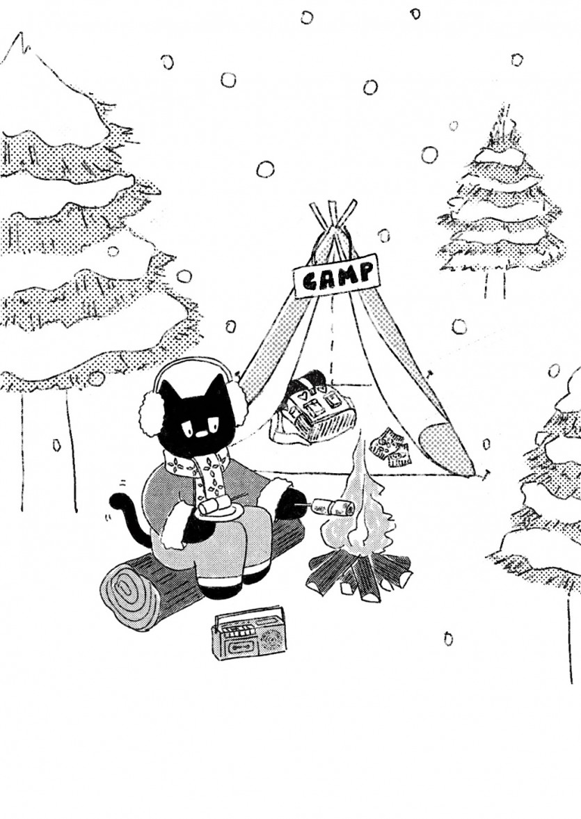 겨울맞이 캠핑중인 깜냥이입니다. 혼자 사색하는걸 즐겨하는 깜냥이는 눈을 맞으며 마시멜로를 구위먹고있어요!