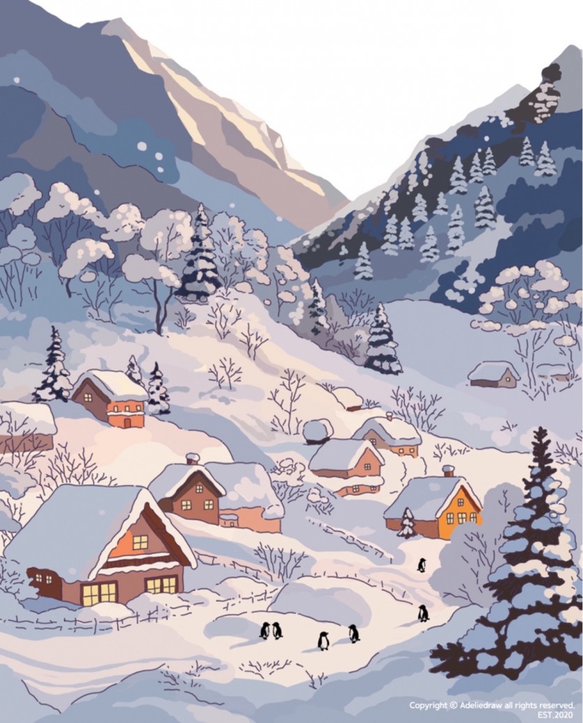 눈이 소복이 내려앉은 숲속, 조용한 나무들 사이로 작은 집들이 오붓하게 자리 잡은 마을이 있어요. 눈 덮인 지붕과 하얀 담장 사이로 퍼지는 고요함 속, 포근한 하늘빛 아래 펭귄들이 옹기종기 모여 따뜻한 하루를 나누고 있어요. 서로의 온기를 나누며 작고 소중한 이야기를 나누는 그 모습은, 마치 겨울날의 동화 한 장면처럼 마음을 포근히 감싸줍니다. 바람조차 조심스레 지나가는 이 작은 마을엔, 하얀 눈보다 더 따뜻한 온기가 스며 있어요.
