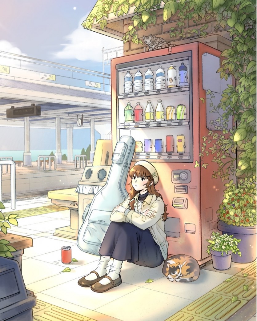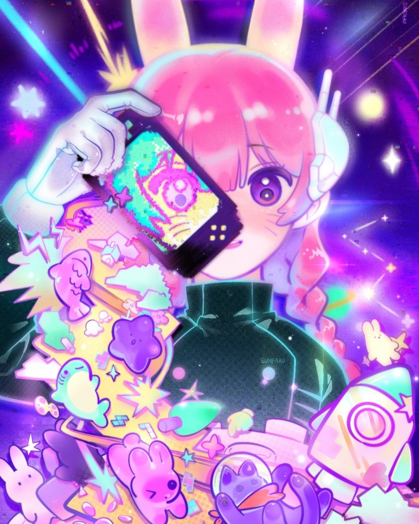 따스한 일상의 빛을 받으며 여운을 느끼는 음악소녀, 트렌디하고 게임 속 반짝이는 세계를 누비는 토끼 우주비행사 그리고 마치 애니메이션 속 한 장면 같은 판타지 세계 마법소녀를 그렸습니다.
