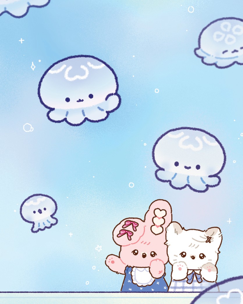 여름의 청량한 느낌을 표현하고자 했습니다. 아쿠아리움에서 해파리를 보는 꼬질이들을 사랑스럽게 표현했습니다.