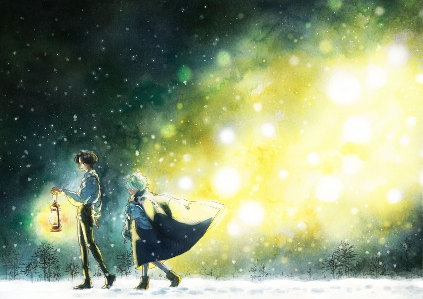 ‘이정표’는 어두운 눈밭 위를 단 하나의 호롱불에 의지해 걸어가는 두 아이의 여정을 그린 작품입니다. 앞장서는 아이는 호롱불을 들고 있고, 뒤따르는 아이는 그 빛을 따라가지만 정작 자신도 어둠 속에서 빛나고 있다는 것을 알지 못합니다.