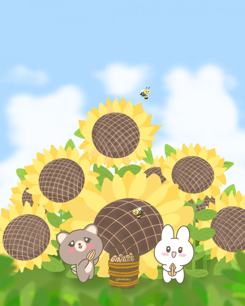 2. 해바라기 씨앗을 수확하는 거고미와 샤토. 해바라기는 금전운을 높혀준대요. 이 그림을 본 사람들의 금전운이 모두 오르기를 빌어요.