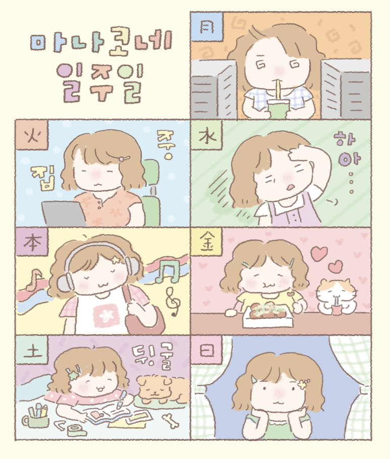 마나코네는 일상속에서의 좋아하는 것들을 가득 채운 따뜻하고 보고있기만해도 행복한 그림들입니다. 스티커, 메모지, 엽서, 포스트 등 굿즈를 만들어 판매합니다.