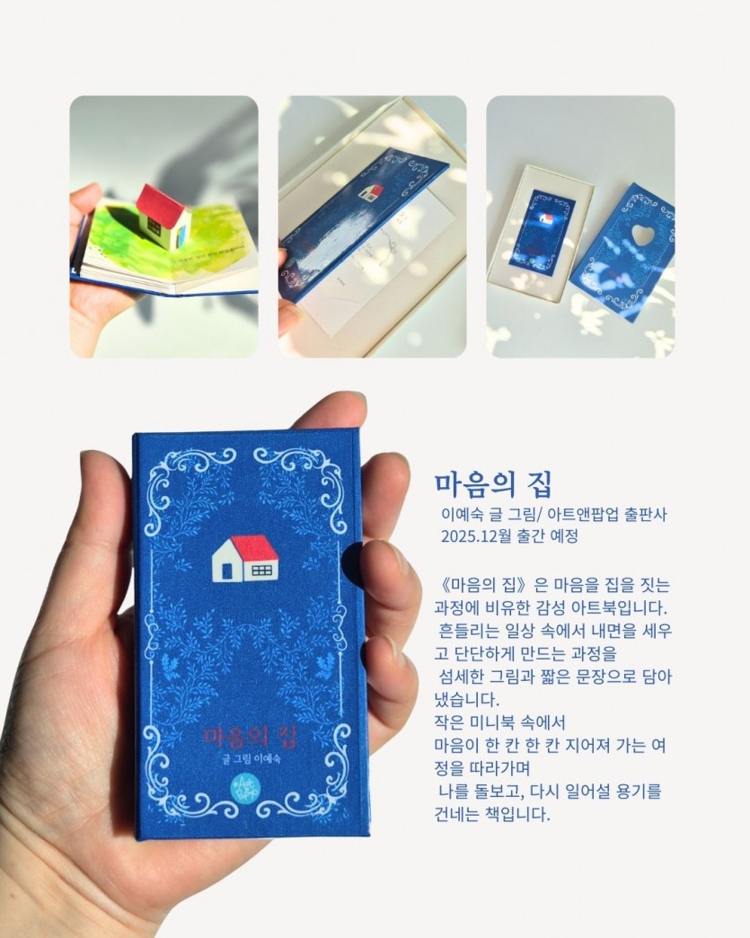 또한 <한글 미니 팝업북>은 ‘작은 책 안에 담긴 거대한 구조’라는 점에서 주목할 만 합니다. 완성본은 손바닥만 한 크기지만, 펼쳐지는 순간 그 안에 숨겨져 있던 공간과 입체 구조가 드러나며, 책의 물성이 확장되는 경험을 제공합니다. 이예숙 작가는 책이 단순히 내용을 전달하는 매체를 넘어 손으로 열고, 움직이고, 조작하며 경험하는 오브제가 될 수 있음을 지속적으로 탐구해 왔습니다. 이 작품 역시 그 철학의 연장선에 있으며, ‘작은 책 속의 조각품’이라는 평가를 받을 만큼 높은 완성도를 갖추고 있습니다.
