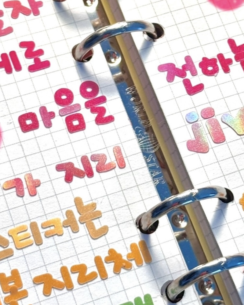스티커지만 손으로 직접 쓴 듯한, 너무 완벽하지 않은, 개성있 는 저만의 글자스티커인 지리체로 왠지 모를 띠뜻함과 친숙함을 느 끼게 합니다. 모든사람들의 모든 순간이 외롭지 않게 여러분 곁에 글씨로나마 늘 함께 할게요.