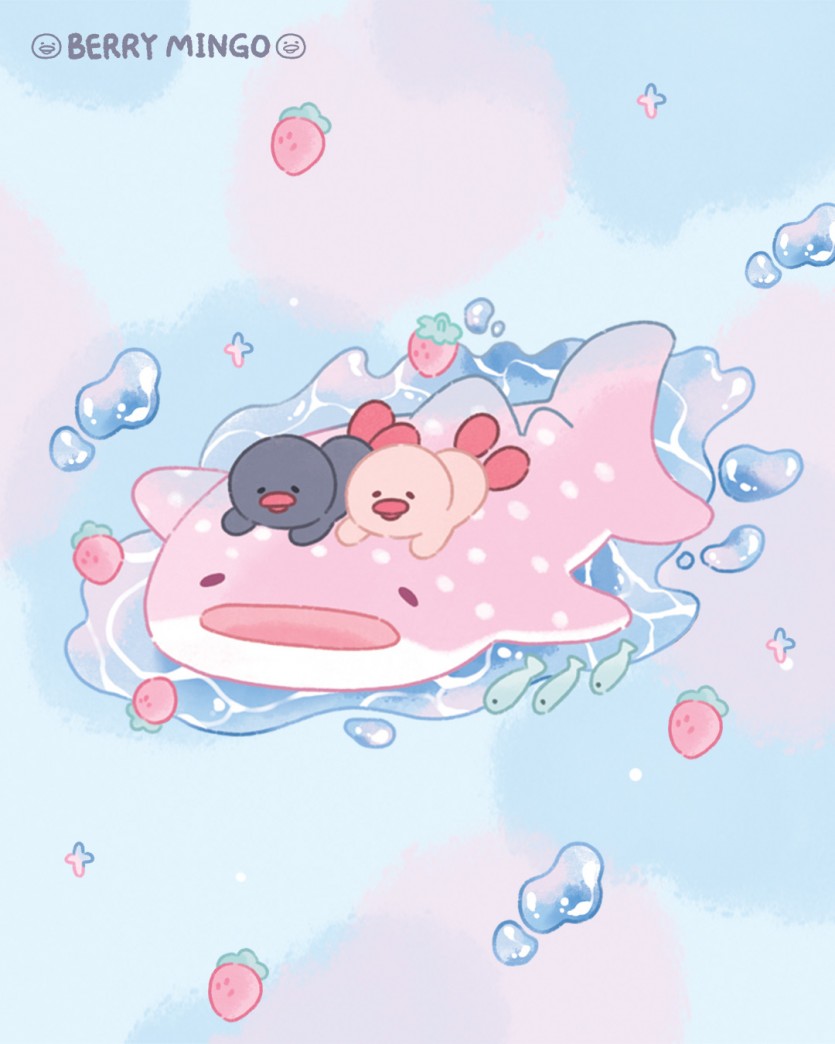 블루베리와 딸기를 먹고 몸 색이 변한 아기홍학 라밍이 까밍이의 일상을 그리고있어요.