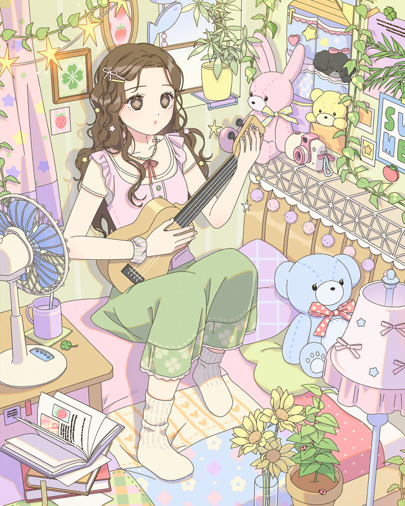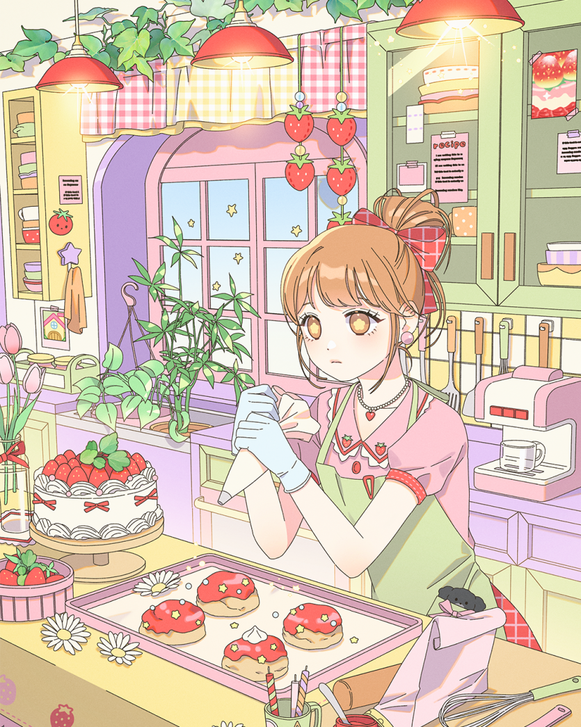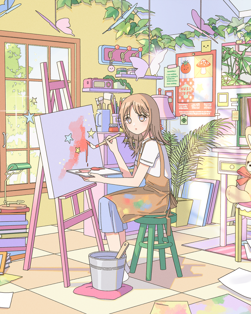 소녀 캐릭터를 메인으로 파스텔톤의 색감을 주로 배치하여 부드러운 느낌의 일러스트를 주로 작업합니다. 인물과 함께 소품과 배경을 가득 채우는 맥시멀한 느낌이 특징입니다.