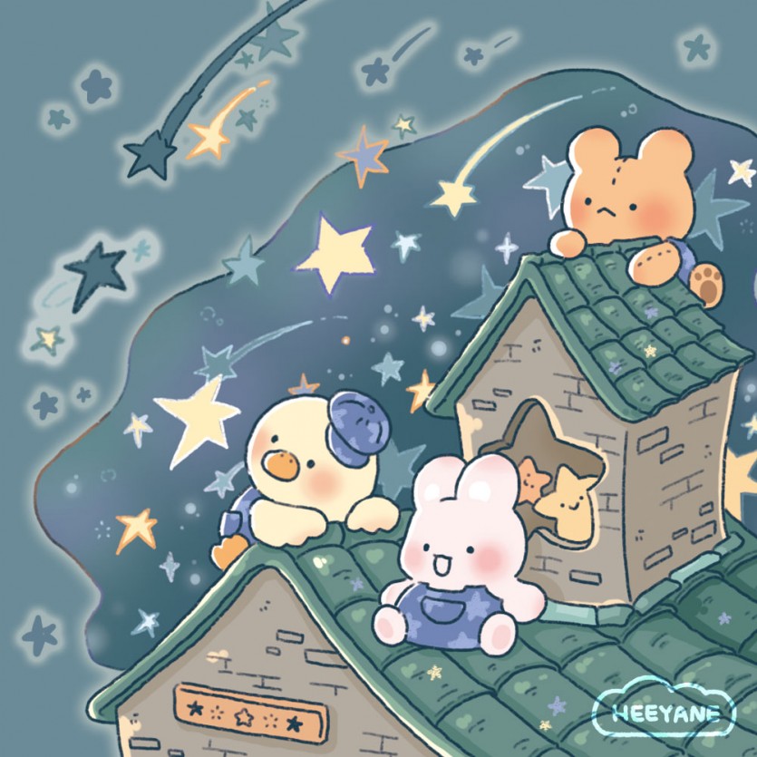 하늘에서 떨어지는 별똥별을 지붕에서 바라보는 히야네친구들입니다.