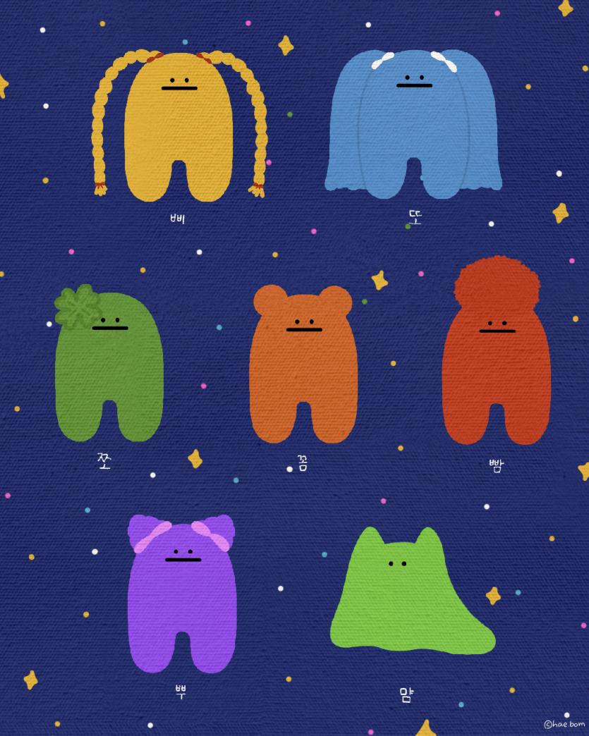 해봄은 작고 귀여운 우주먼지 외계인인 '몽지별 친구들' 과 함께하는 브랜드로, 소소한 일러스트와 문구,핸드메이드 인형 등을 만들고 있습니다. 봐주시는 모든 분들이 몽지별 친구들과 웃으실 수 있기를 바랍니다:)