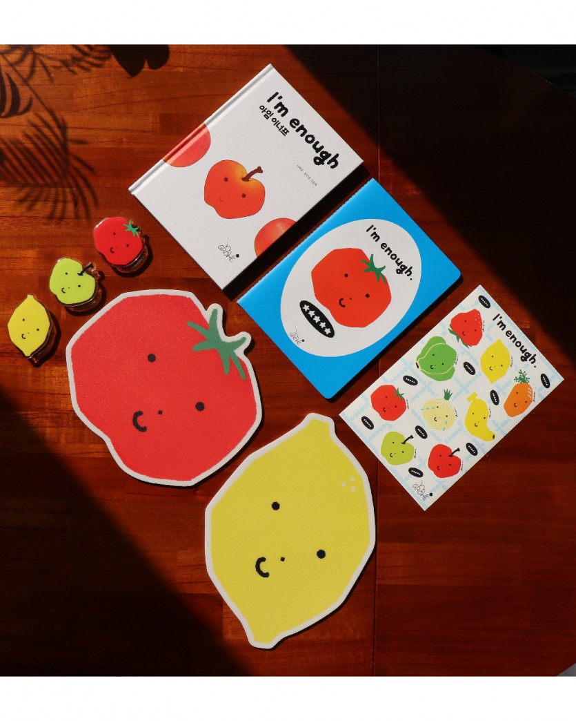 “아임이너프” 프로젝트는 그로위 디자이너의 한 사과 그림에서 출발했습니다. 자신감 넘치는 표정에 자신에게 별 다섯 개를 붙이고 "I'm enough"를 적은, 피식 웃음이 나오는 재치 있는 그림이었습니다. 그리고 이 사과 그림은 보면 볼수록 공감의 메시지가 담긴 일러스트라고 생각되었어요. 누군가가 정해둔 기준을 떠나, 자신을 충분히 멋있고 사랑스럽게 여기는 모습으로 느껴졌습니다.