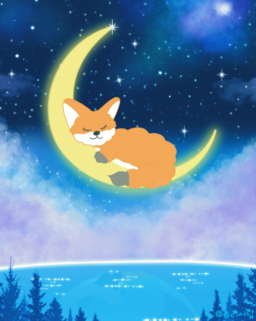 초승달 위에 여우가 안식을 취하고 있는 작품 ‘여우달’은 해먹 위에서 새우잠을 자는 모습을 보고 초승달을 해먹과 같은 안식처로 표현하여 여우가 호숫가를 뛰놀다 잠시 쉬어가는 모습을 그린 작품입니다.