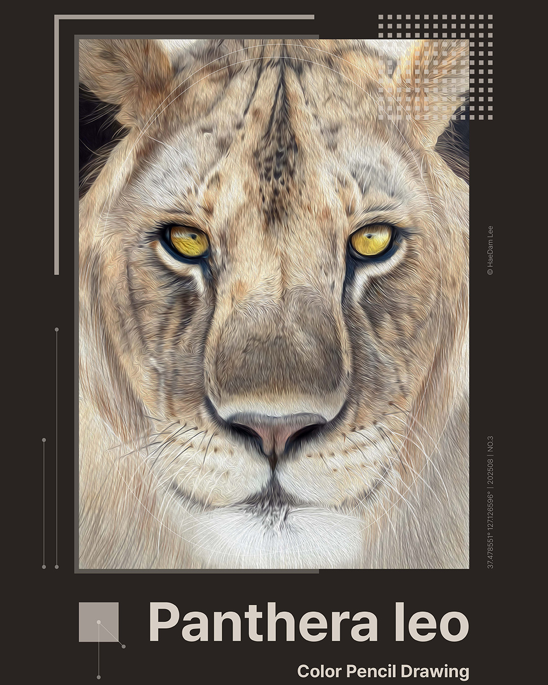 색연필의 세밀한 묘사와 디지털 기법을 결합해 동물의 존재감을 탐구한 작업입니다. 화면 속에는 사실적인 디테일과 감각적인 구성 요소가 함께 어우러지며, 눈빛과 질감, 움직임의 흔적이 생생하게 드러납니다. 단순히 외형을 재현하는 것을 넘어, 각 장면이 지닌 긴장감과 리듬을 포착하여 동물의 순간적 에너지를 시각화합니다. 건축 전공에서 비롯된 공간적 시선과 균형 감각은 작품 전반에 안정된 구조와 깊이를 부여하며, 이는 세밀한 관찰과 정교한 표현이 결합된 독창적인 화면으로 이어집니다. 결과적으로 작품은 동물이 지닌 고유의 생명력을 정제된 형식 속에서 선명히 드러냅니다.