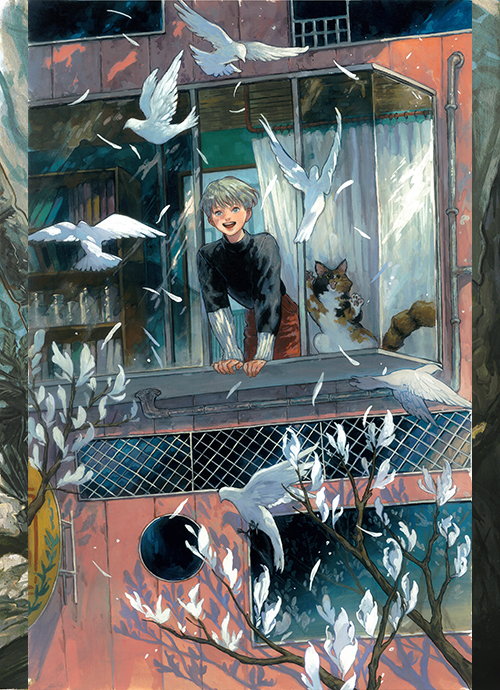 분명 어제까지만 해도 앙상하던 나뭇가지에는 어느새 꽃이 피었고, 그 위로 하얀 새들이 춤을 추며 노래를 부르고 있다. 고양이도 새들과 함께 놀고 싶어서 아이를 부른 것이다.