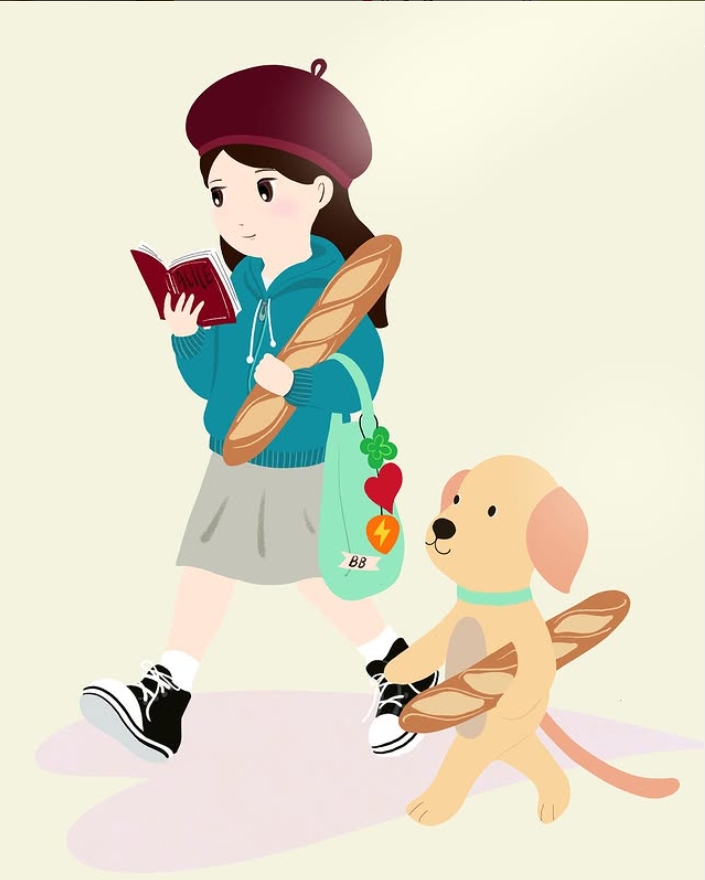 느긋한 리트리버가 콧노래를 부르며 갓 구운 바게트를 사 가지고 걸어가요.