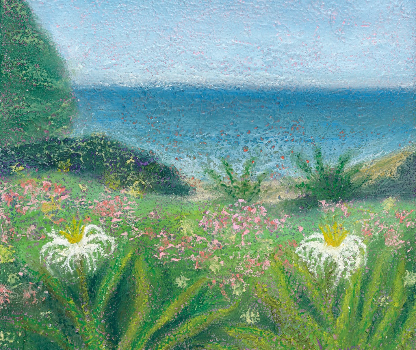 여름 바닷가의 잔잔한 수평선 위로 햇살이 부드럽게 번지고, 바람과 파도의 숨결만이 조용히 오가는 가운데, 시간마저 잠시 멈춘 듯한 평온함이 화면 가득 머무는 안온하고 고요한 풍경