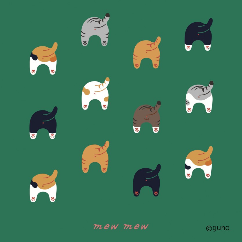 [궁디] 고양이를 키우는 분들이라면 고양이 엉덩이의 매력에 빠져들 것이다. 고양이 엉덩이를 보고 있노라면 궁디팡팡을 해주고픈 마음이 일렁인다. 고양이의 뒷모습을 단순화 하고 패턴화 한 후 안정감을 주는 초록 컬러를 배경으로 고양이의 뒷 실루엣이 대비되며 부각되는 아이코닉한 이미지다.