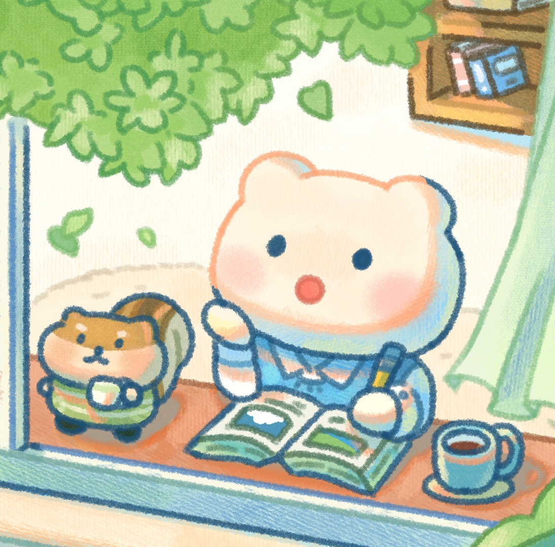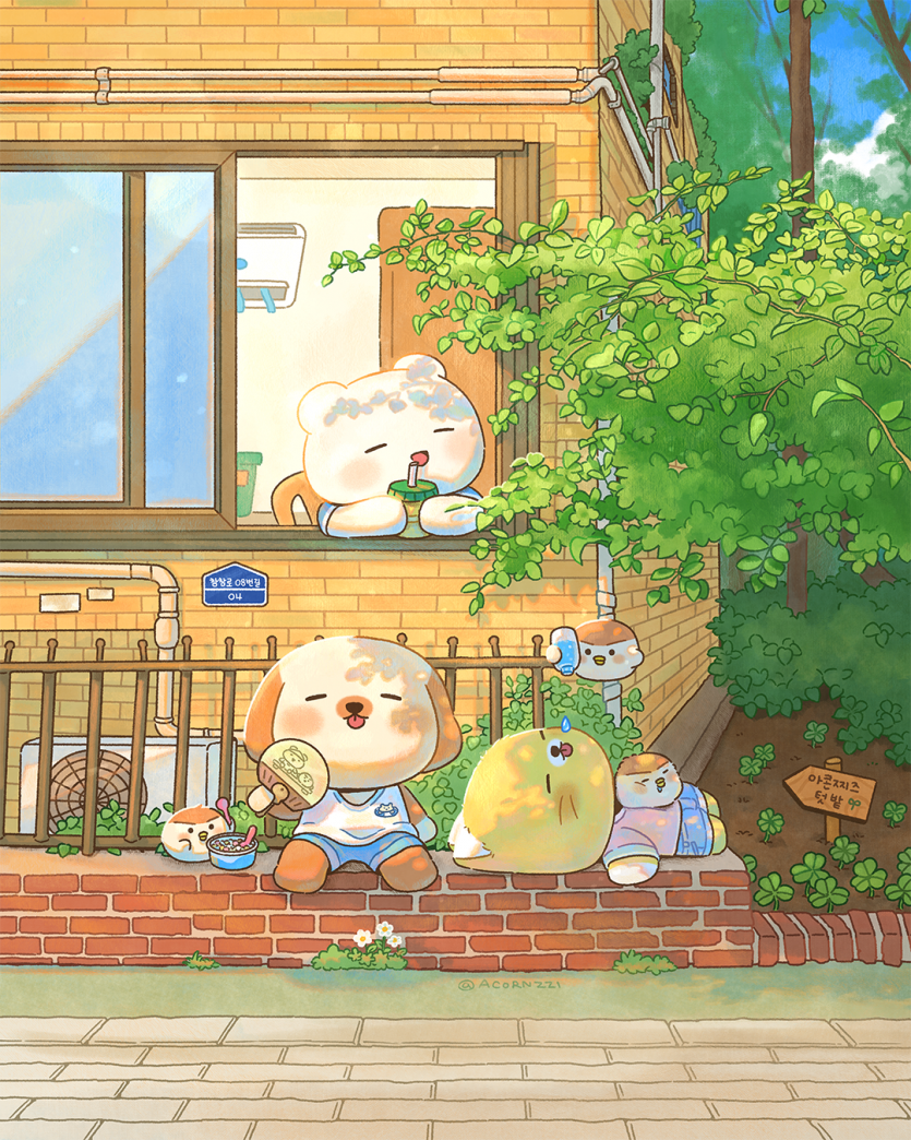 아콘찌즈의 포근한 일상을 그리는 캐릭터 일러스트레이터입니다. 다람쥐가 되고싶은 아콘찌, 활발한 고양이 찌즈, 게으른 강아지 스모어피, 푹신한 곳을 좋아하는 참새 참참이. 아콘찌즈의 평범한 일상을 따뜻한 색감으로 표현합니다.
