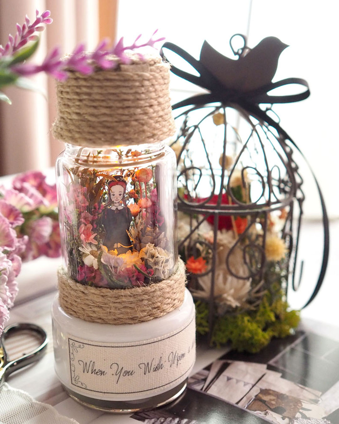 작가는 빨간머리앤과 같은 감성 일러스트부터, 한국 전통 문양인 일월오봉도, 자개나비, 원석을 활용한 소품까지 폭넓게 작업하며, 그림과 공예를 결합한 핸드메이드 굿즈를 선보입니다. 프리저브드 플라워를 활용한 메모리아 박스, 요정램프 오르골, 꽃자석 등 작품은 단순한 소품을 넘어, 일상의 기억과 감정을 담아내는 작은 정원으로 표현됩니다.