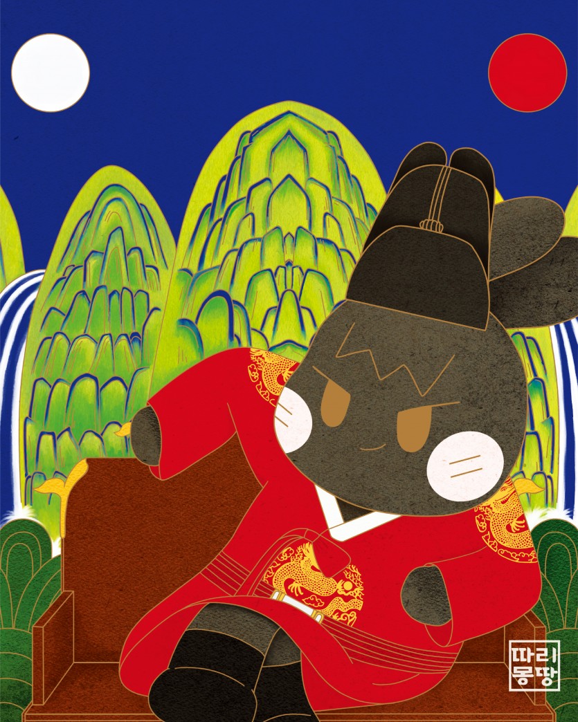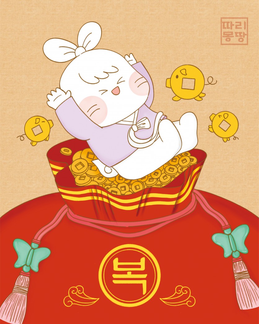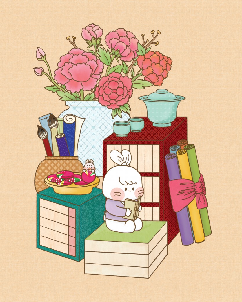 작품 속 모란은 부귀영화를, 곱게 묶인 색동 비단은 다채로운 가능성과 희망을, 과일과 떡은 풍요와 나눔을, 붓과 두루마리는 창작과 기록의 가치를 의미합니다. 이러한 전통적 상징물은 원래의 의미를 이어가면서도, 캐릭터와 함께 조화를 이루어 오늘날의 감각으로 새롭게 표현됩니다. 특히 사랑스러운 색채와 귀엽고 따스한 캐릭터성이 어우러져, 전통을 보다 친근하고 즐겁게 느낄 수 있도록 그려낸 것이 이 작품의 큰 특징입니다.
