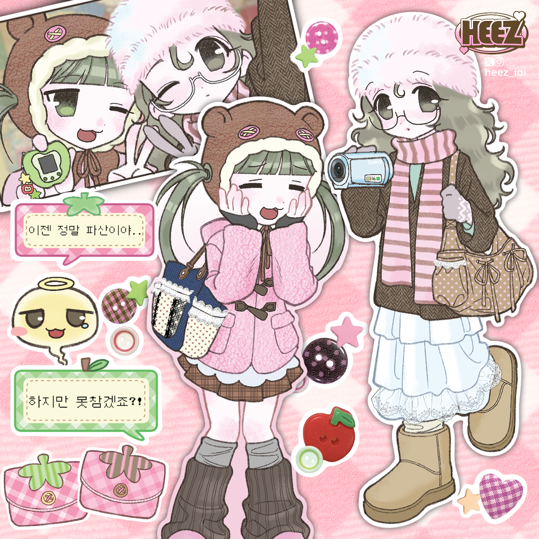 캐릭터와 다양한 소품들이 이어지듯 배치되어 작은 스토리를 만들어냅니다. 곰돌이 모자, 털모자, 니트 소재처럼 보송한 촉감이 느껴지는 디테일을 강조했고, 체크 패턴이나 파우치 같은 아기자기한 요소들은 작품의 귀여운 분위기를 더해줍니다. 말풍선 속 짧은 대사들은 일러스트 페어에서 흔히 느끼는 ‘사고 싶지만 고민되는 마음’, ‘기대와 즐거움 사이의 감정’을 가볍고 유머러스하게 담아냈습니다.