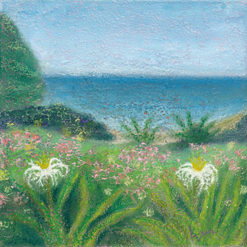여름 바닷가의 잔잔한 수평선 위로 햇살이 부드럽게 번지고, 바람과 파도의 숨결만이 조용히 오가는 가운데, 시간마저 잠시 멈춘 듯한 평온함이 화면 가득 머무는 안온하고 고요한 풍경